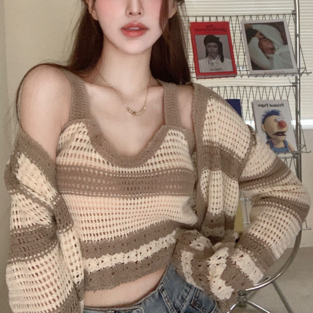 Striped Knitted Cardigan Female Design Sense Of A Small Pure Windy Hottie Short Top Summer Autumn Chic Sling Two Sets HZ0108