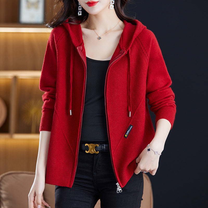 2025 New Autumn And Winter Hooded Knitted Cardigan Women's Ocean Loose-Fitting Smozer Women's Double Zipper Knit Coat HZ0108