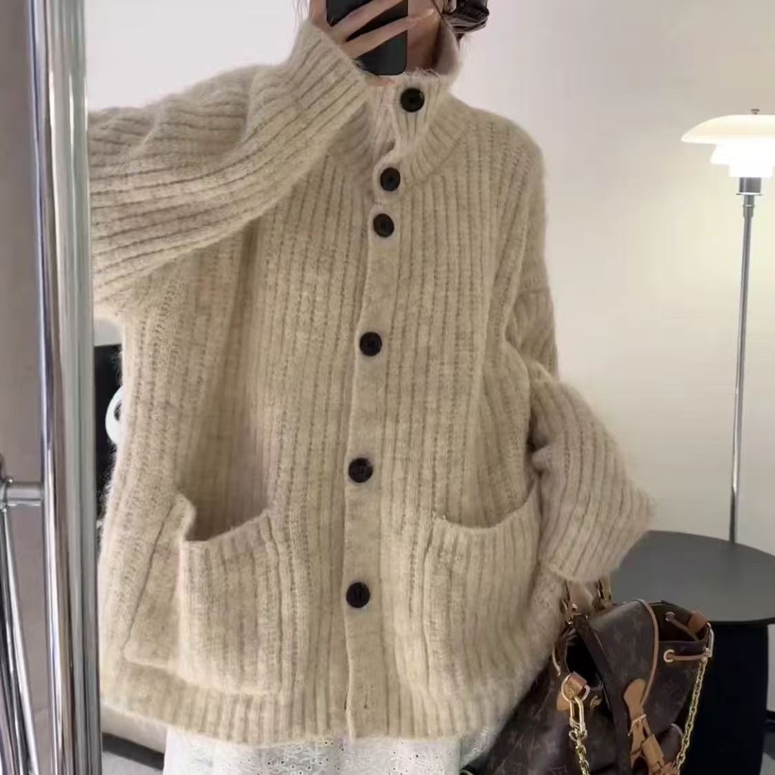 Korean Wearing A Lazy Wind Collar Sweater Autumn And Winter Women's High Sense Of Loose Soft Knitted Knitted Jacket Coat HZ0108