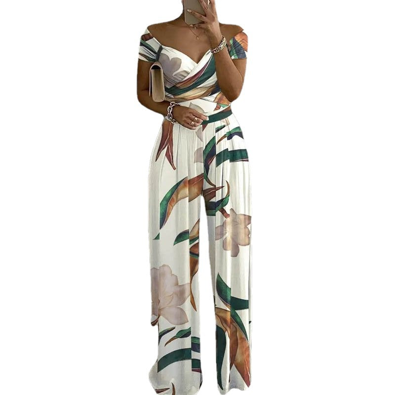 2025 New Commuting Women's Single-Word Shoulder-Print Trousers Sexy High-Waisted Jumpsuit HZ0108