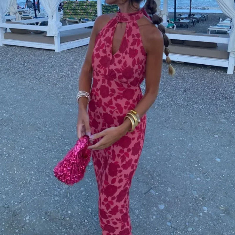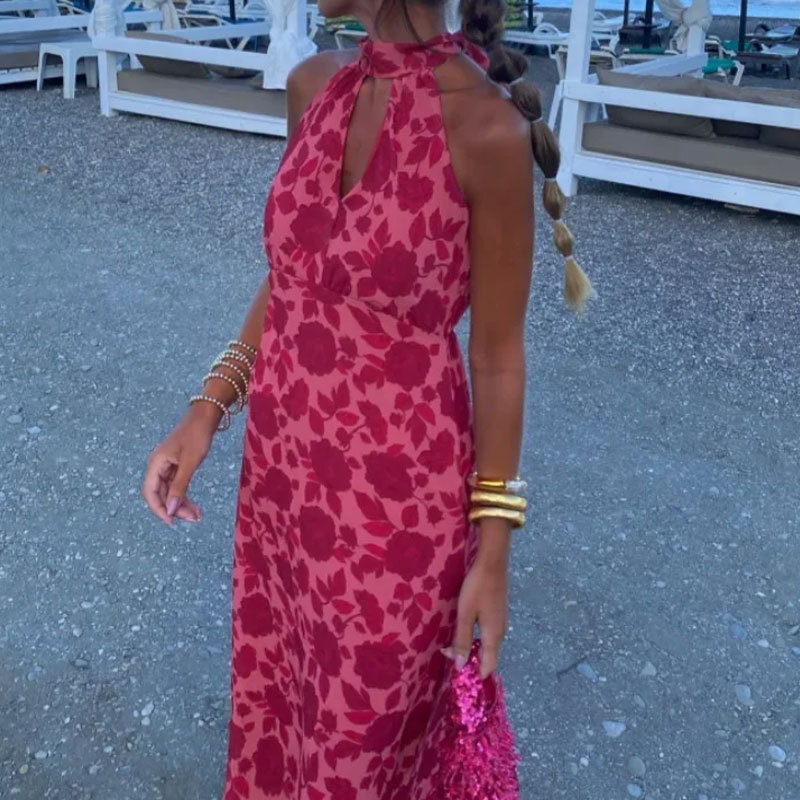 2025 New Hanging Neck Sleeveless Dress Bare Back High-Rise Printed Long Dress Famous Wind Thin HZ0108