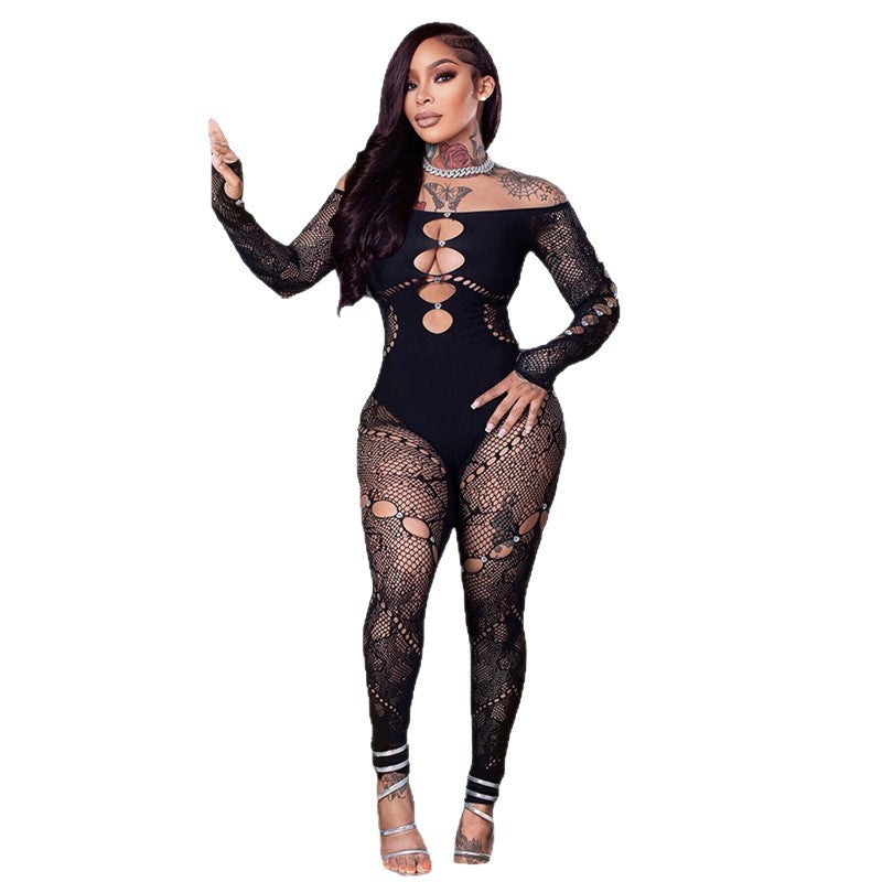 2025 Solid Color Shoulder Long Sleeves Hollow Drill High Waist Repair Body Knitted Jumpsuit Sexy Hollow HZ0108