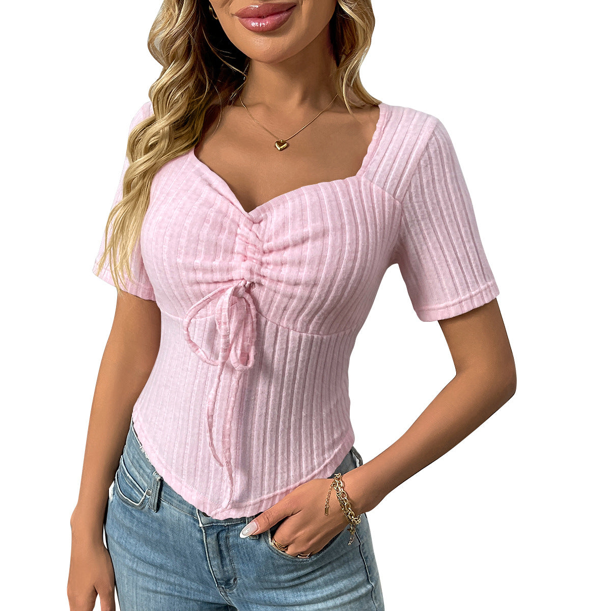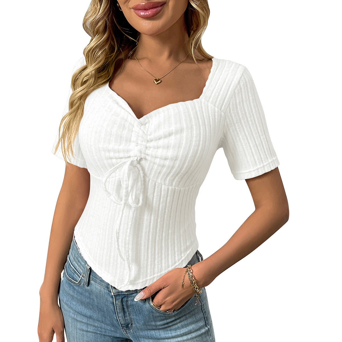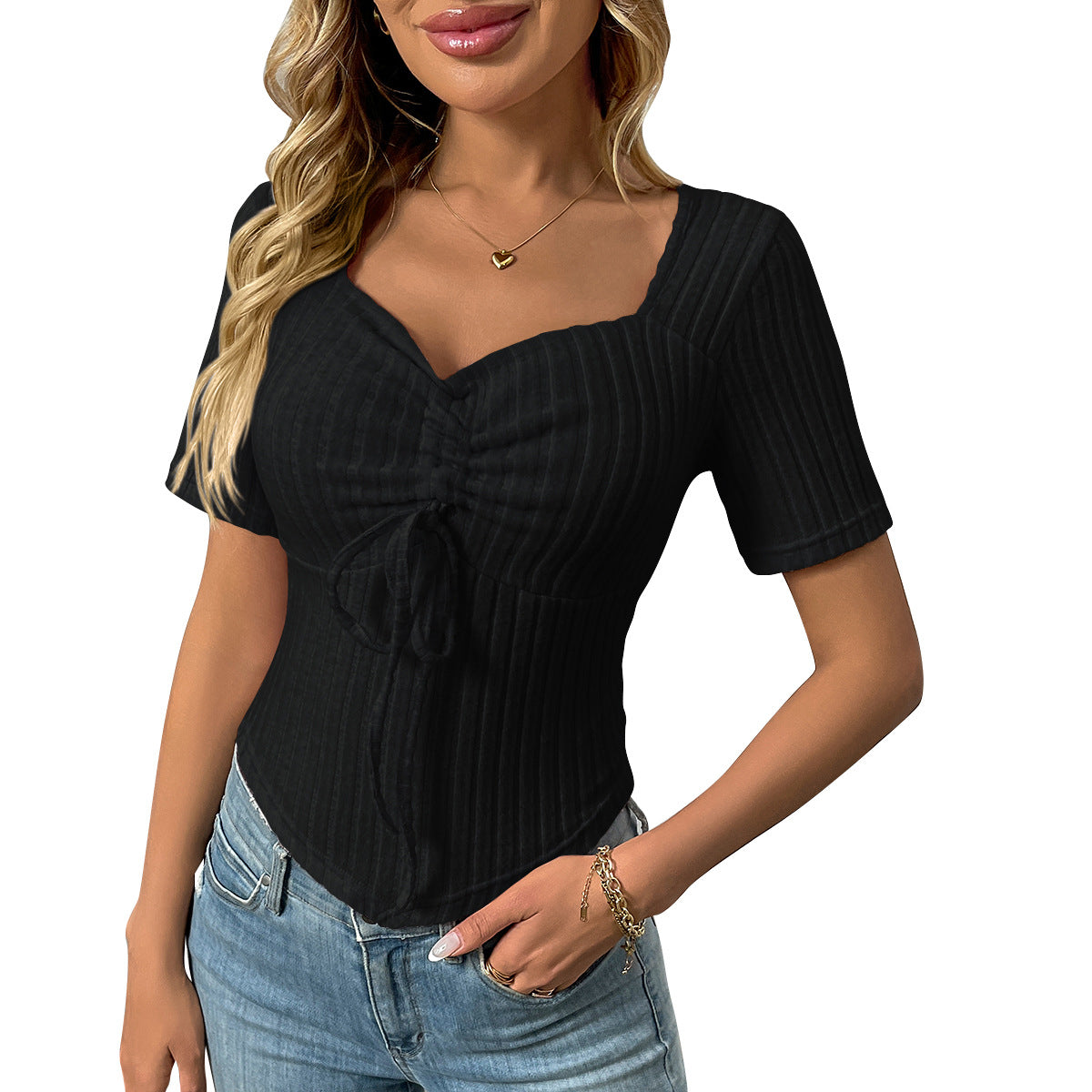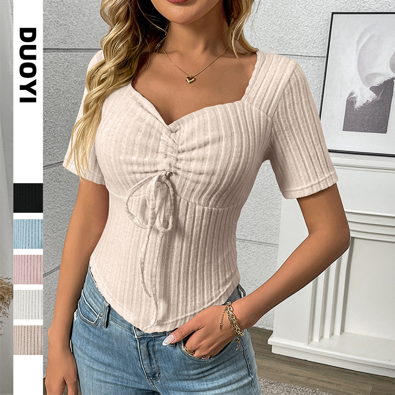 2025 Summer New Fashion Folding Drawstring Sexy Short-Sleeved Top HZ0108