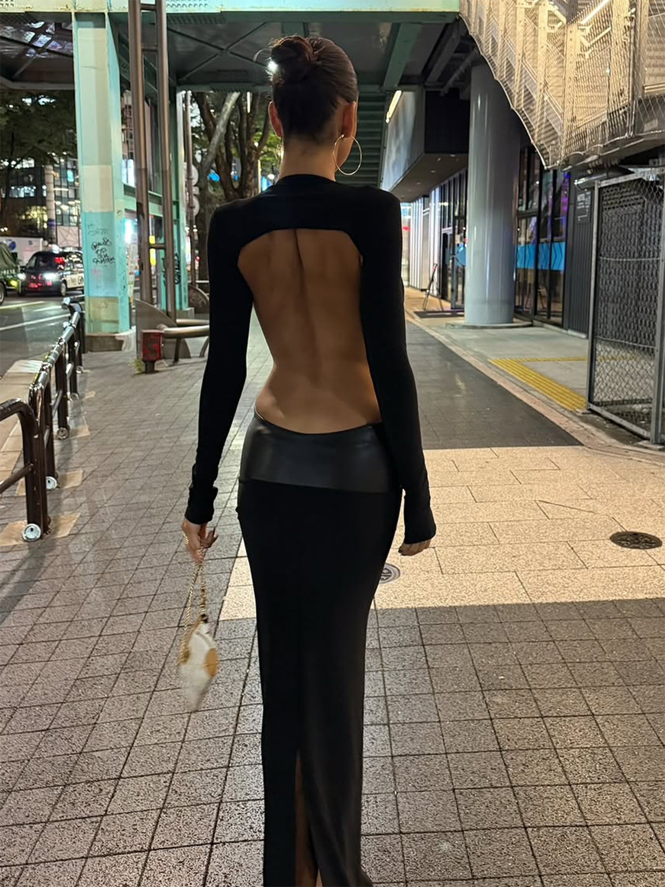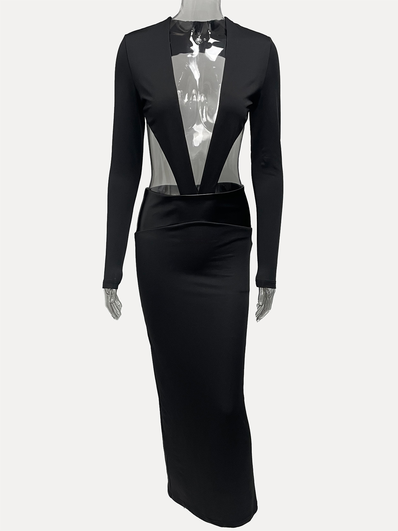 Autumn 2025 New Sexy Deep V Hollow Fake Two Leather Spliced Long-Sleeved Bag Hip Dress HZ0108