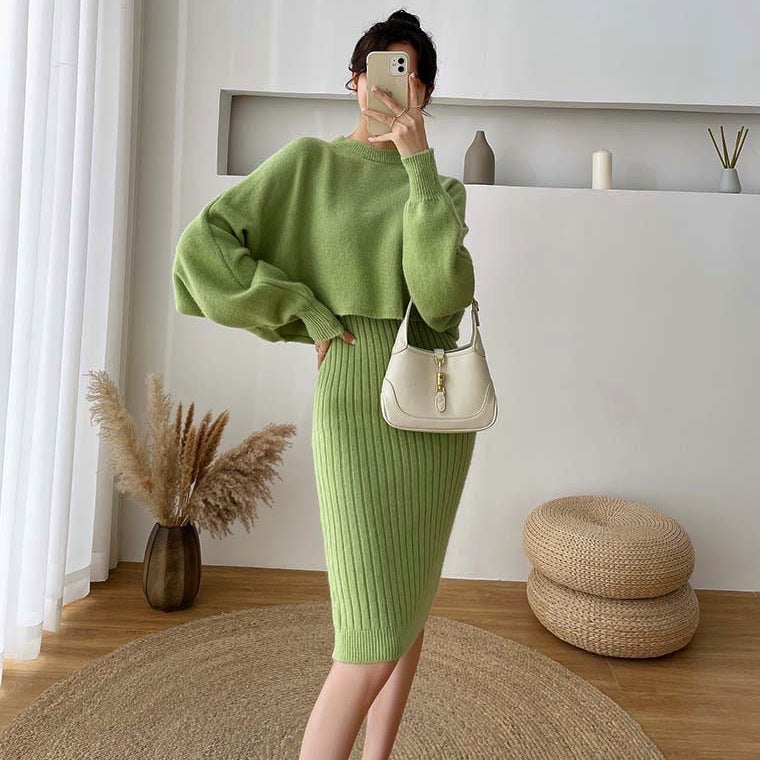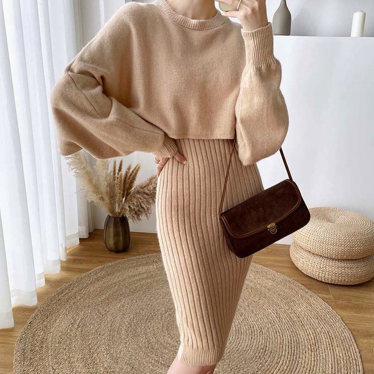 Autumn And Winter Korean Version Of Lazy Sweater Women Loose Chic Hoodie Top Two Sets Of Knitted Sling Vest Dress HZ0108