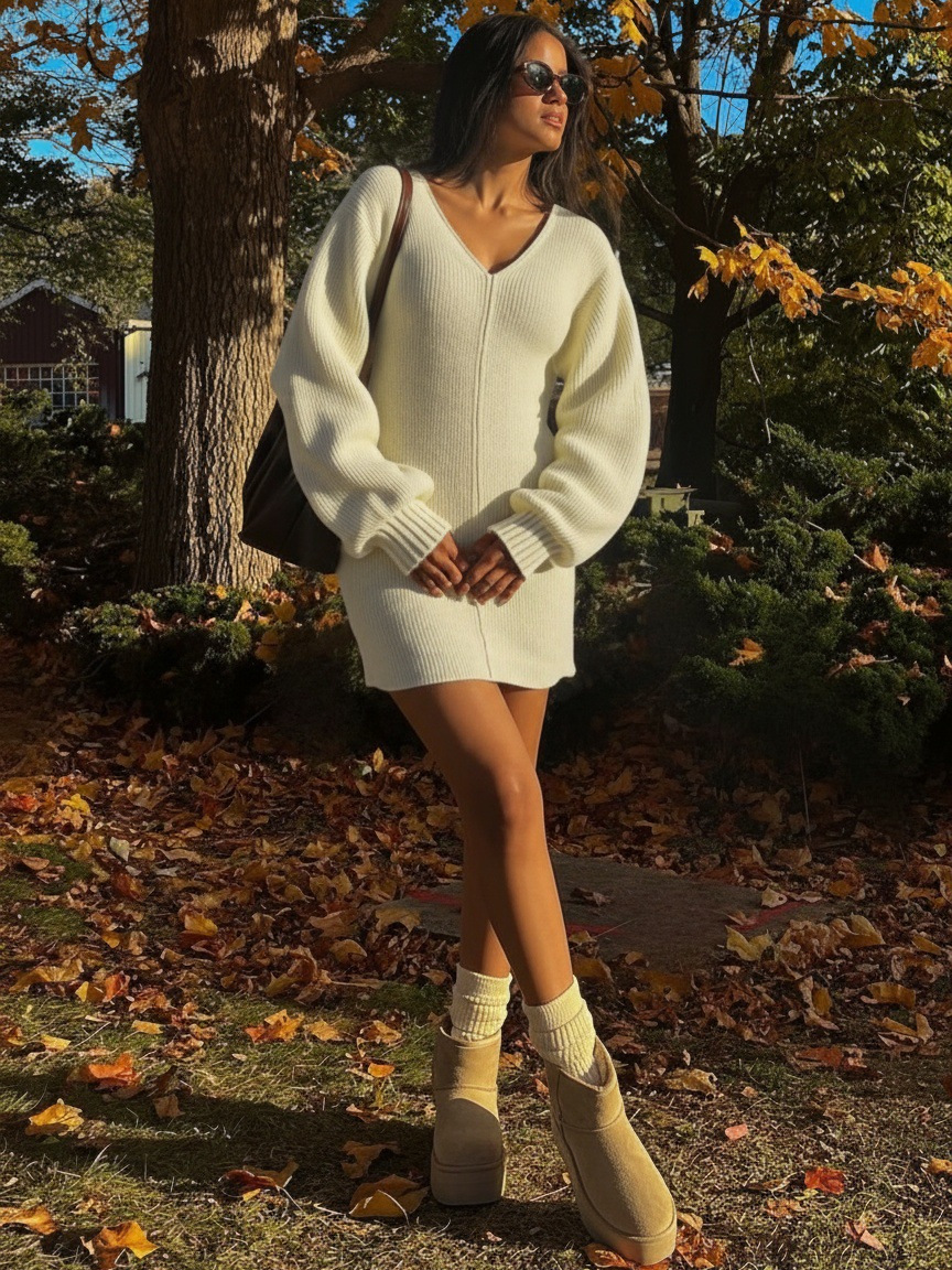 Autumn/Winter 2025 New Women's Fashion Sexy V-Neck Solid Color Classic Knitted Dress HZ0108