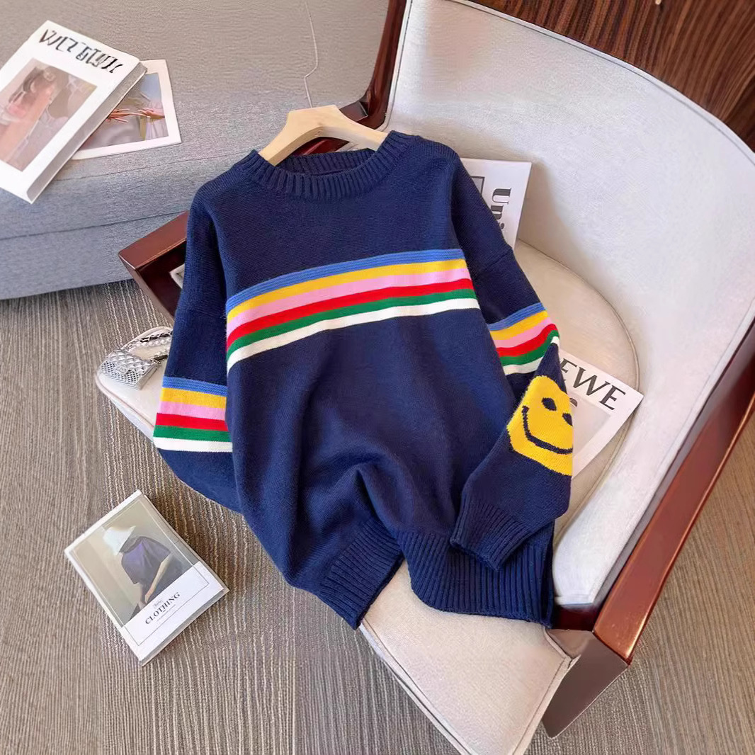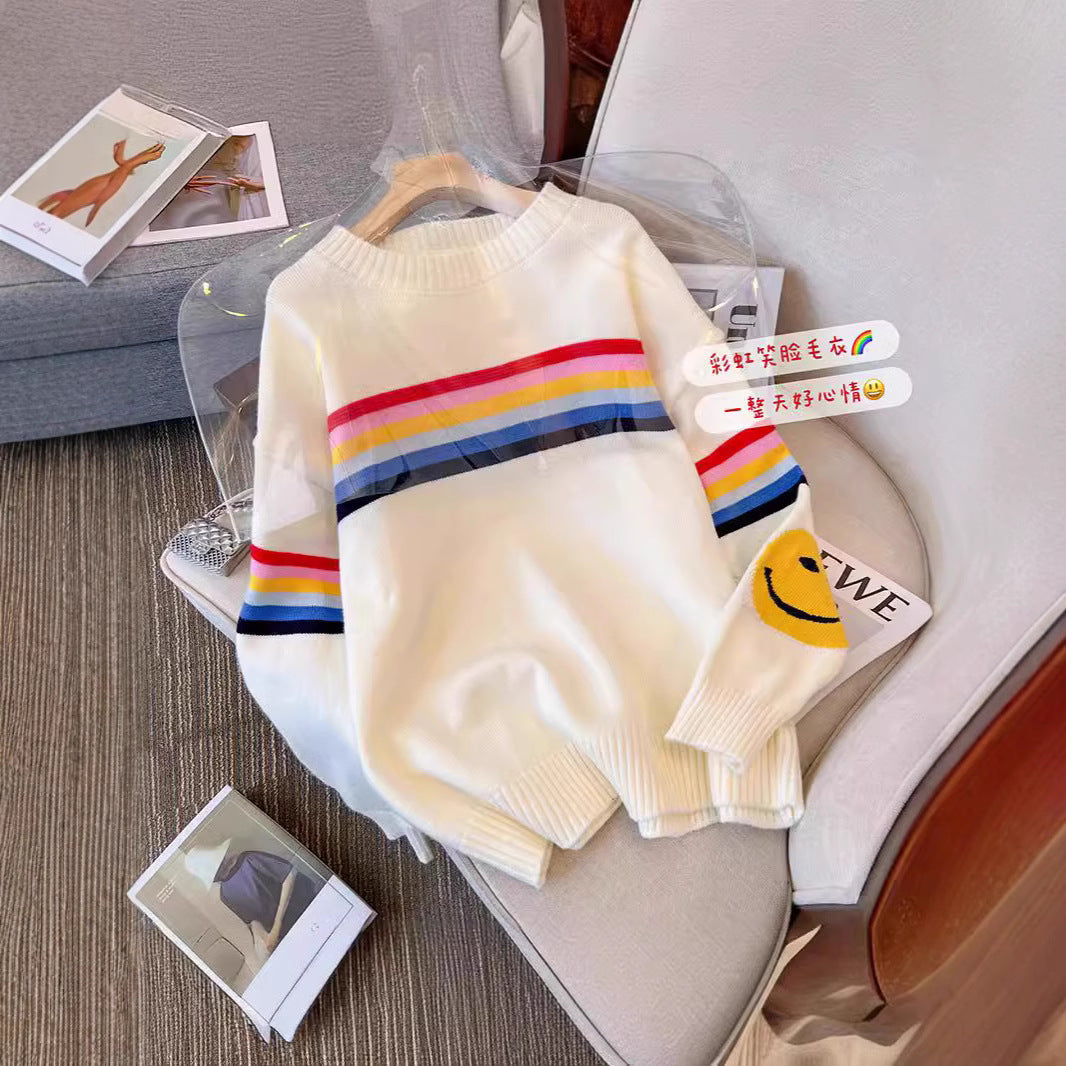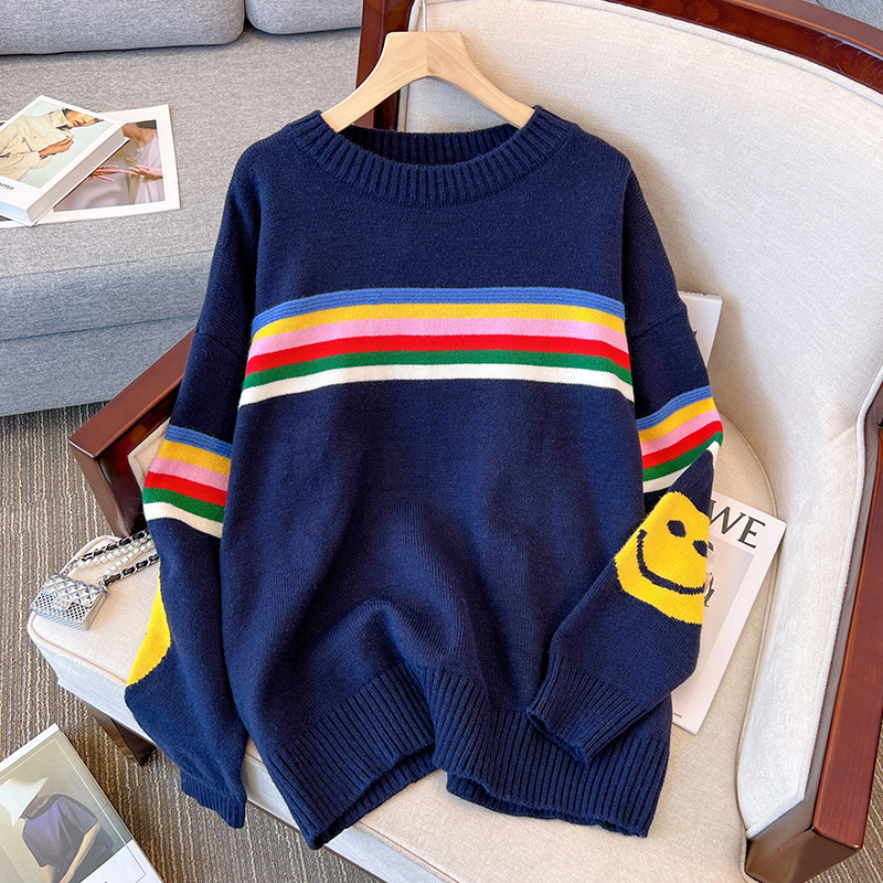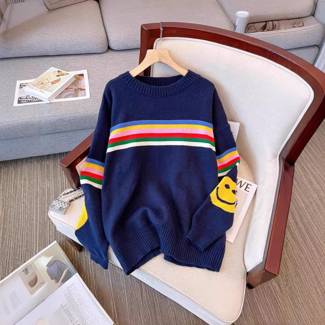 Colored Striped Smiley Face Long-Sleeved Sweater Women's Autumn And Winter New Lazy Style Retro Loose Collar Knitting Top HZ0108