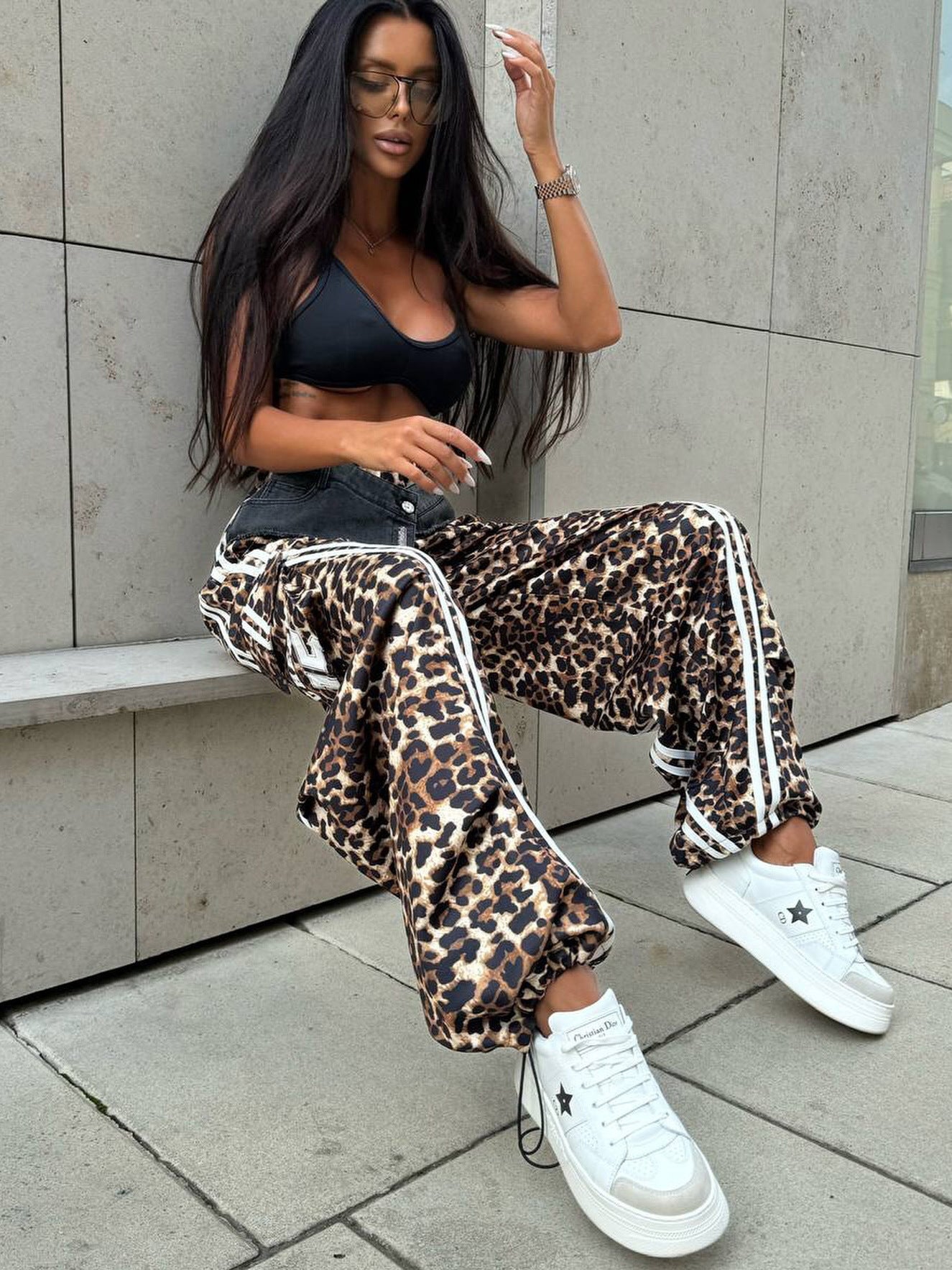 Cowboy Splicing Leopard-Print Slacks Street Trendy Striped Broad Leg Trousers High-Waisted Loose Leisure Trousers HZ0108