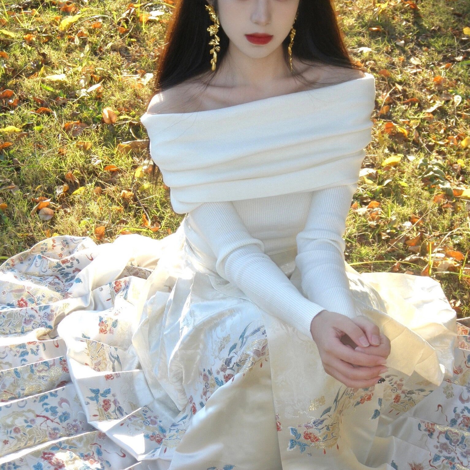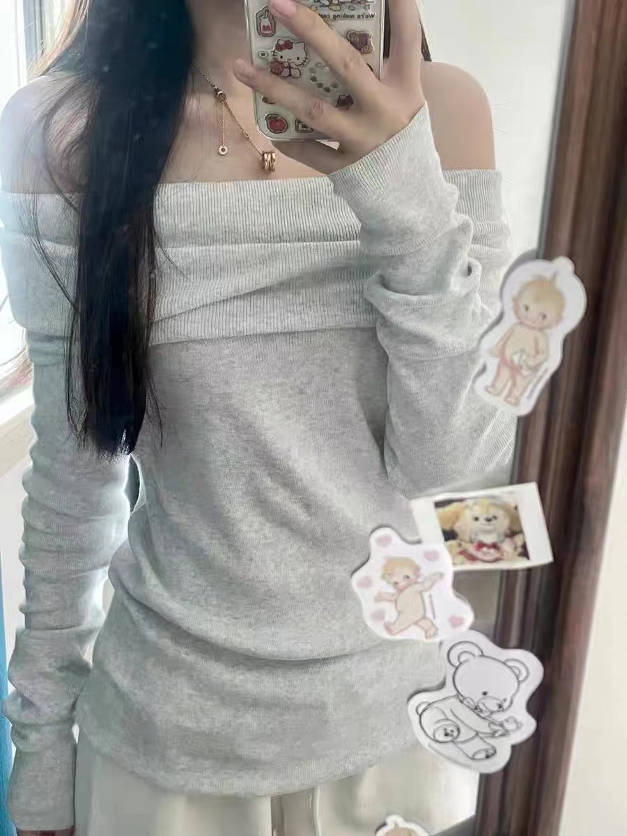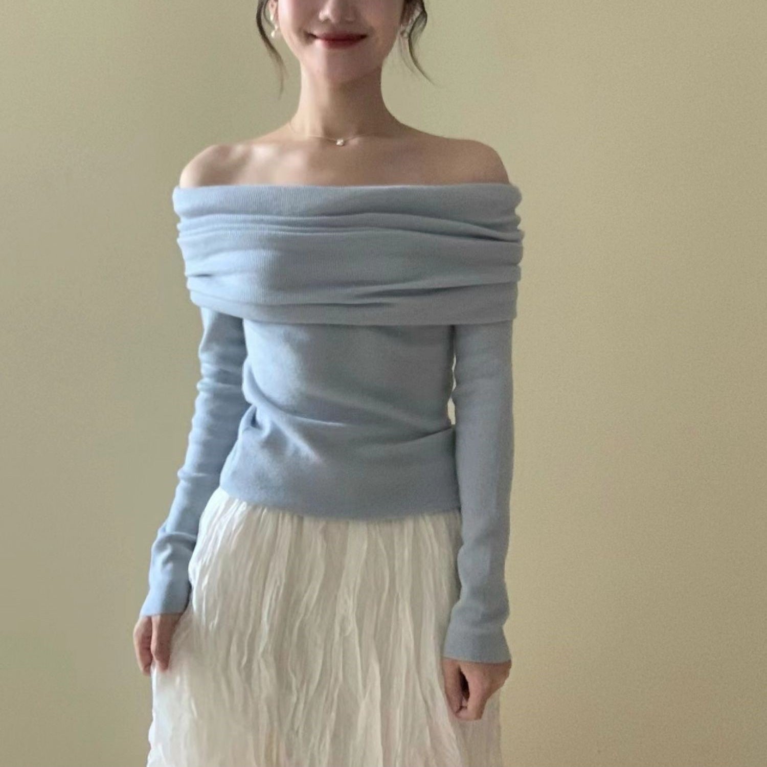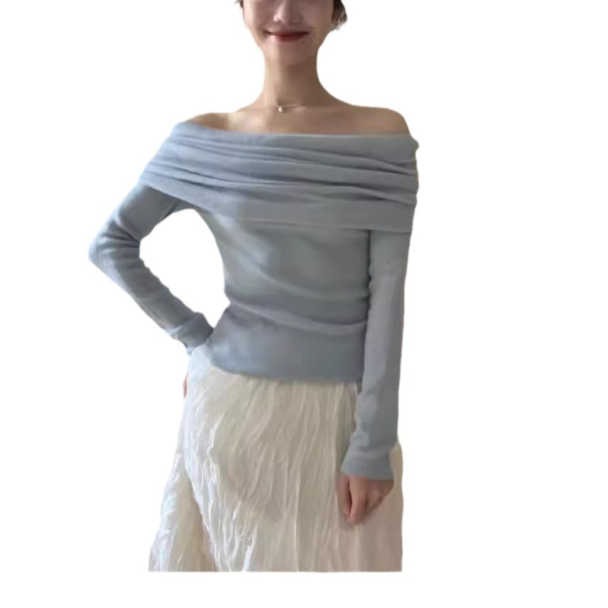 French High-Level Sense Shoulder Long-Sleeved Knitted Shirt Spring Temperament Gentle And Elegant Shoulder Chic Beautiful Little Blouse Tide HZ0108