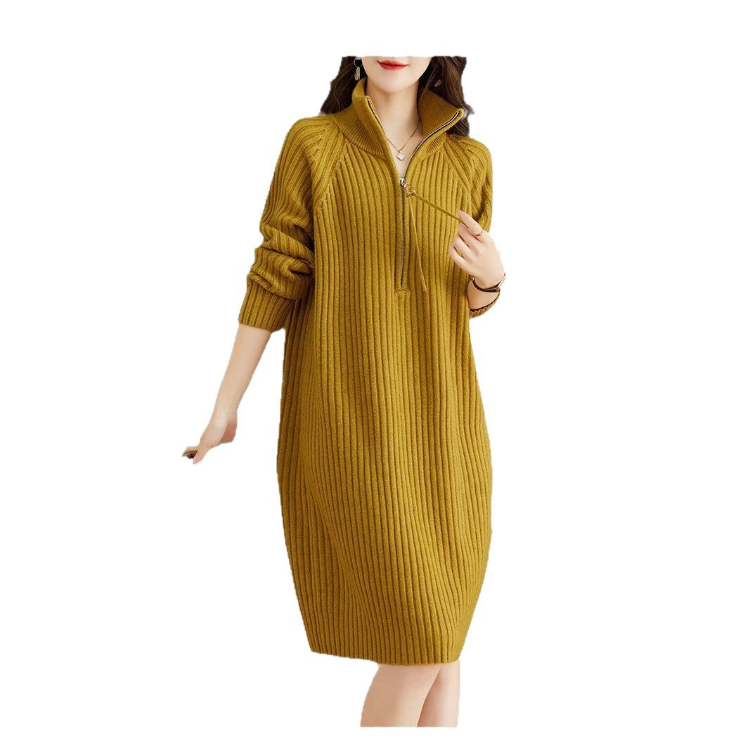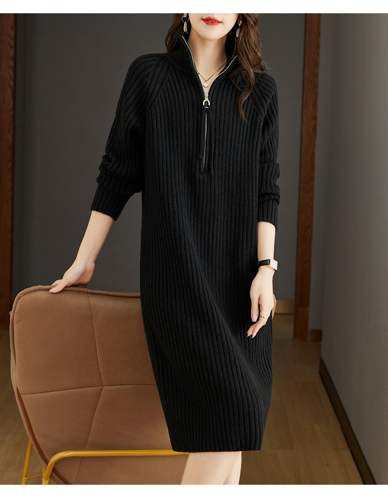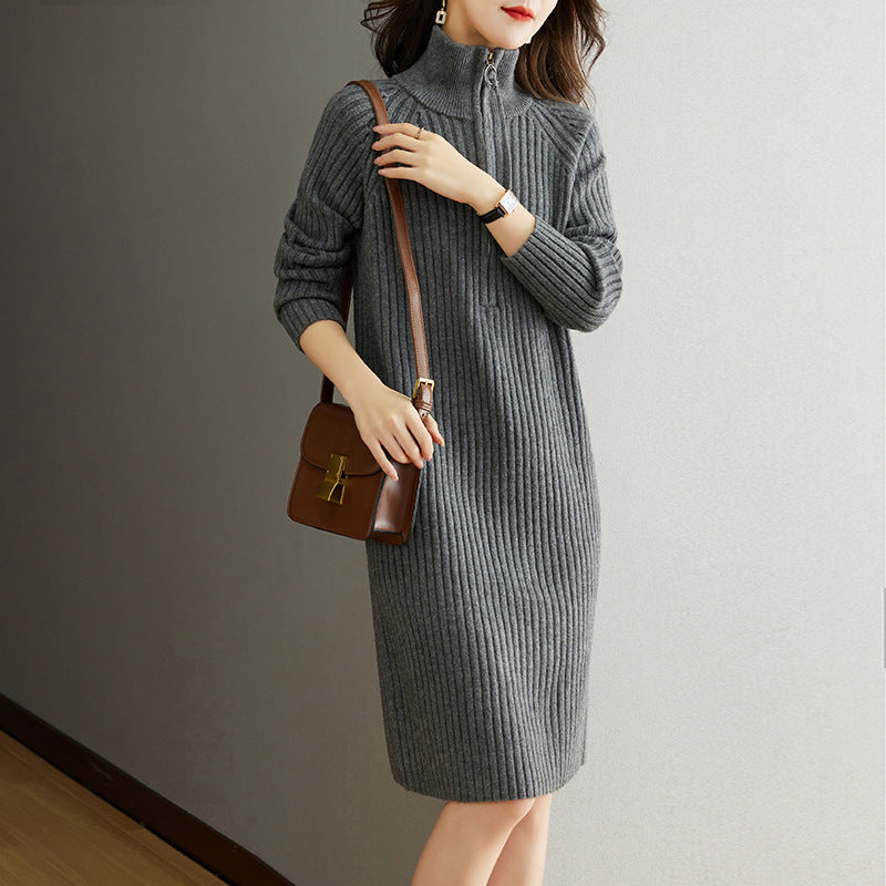 French Temperament Knitted Dress Women's Autumn And Winter 2025 New Half-Zip Chain Leisure Long Sleeve Collar Sweater Dress HZ0108