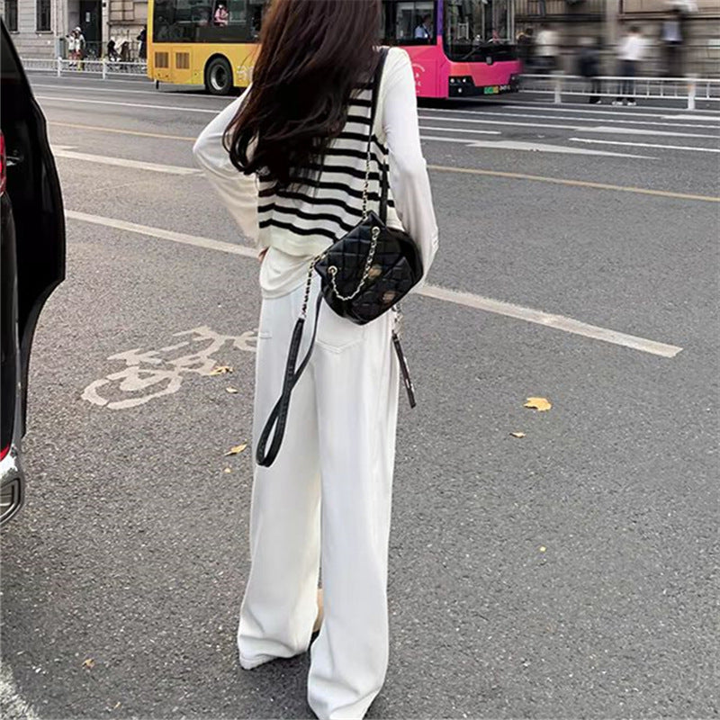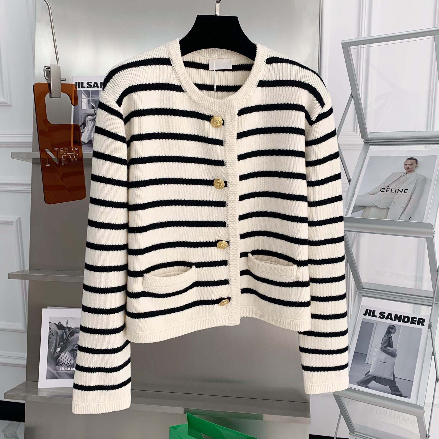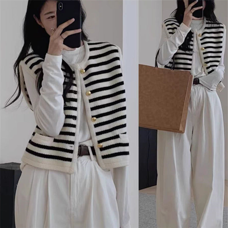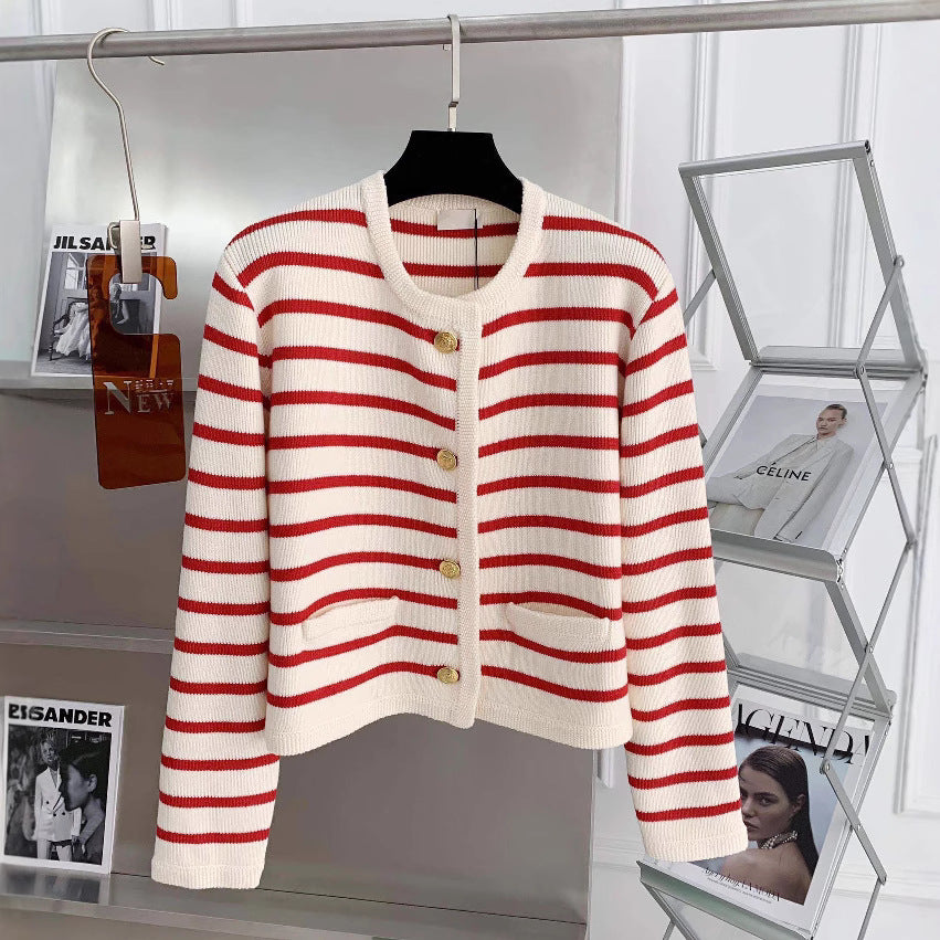 Gold Buckle With Striped Round Collar Small Fragrant Knitted Cardigan Girl Spring And Autumn French Loose Short Outer Sweater Coat HZ0108