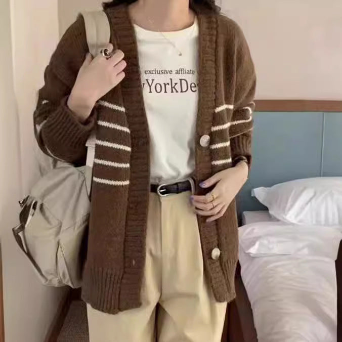 Hong Kong Flavor Retro-Colored Striped Knitted Cardigan Coat Women's Autumn And Winter Women's Loose Lazy Casual V-Neck Sweater HZ0108