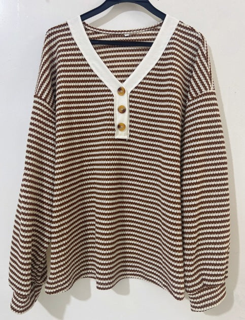 TK2025 New Lady V-Neck Button Casing Splicing Casual Long-Sleeved Color T-Shirt HZ0108