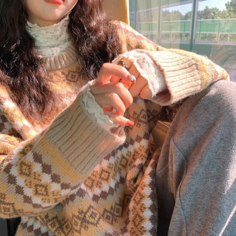 Vintage Jaccupy Rhyme Loose Knitted Sweater Female Students 2025 New Autumn And Winter Wear Lazy Wind HZ0108